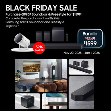 The ultimate audio and video duo. Get up to $300 off Select Sound Device when Purchased with Eligible Samsung TV