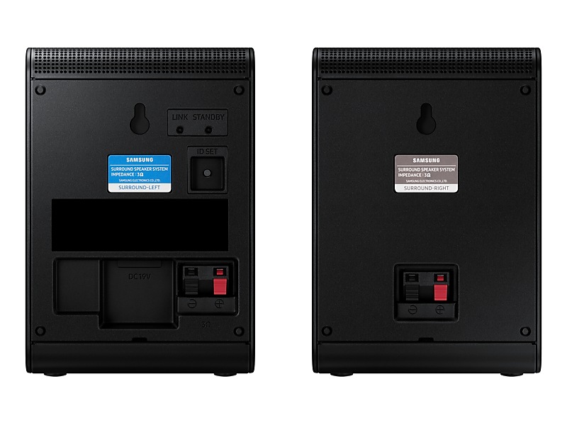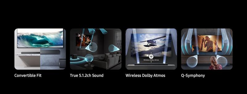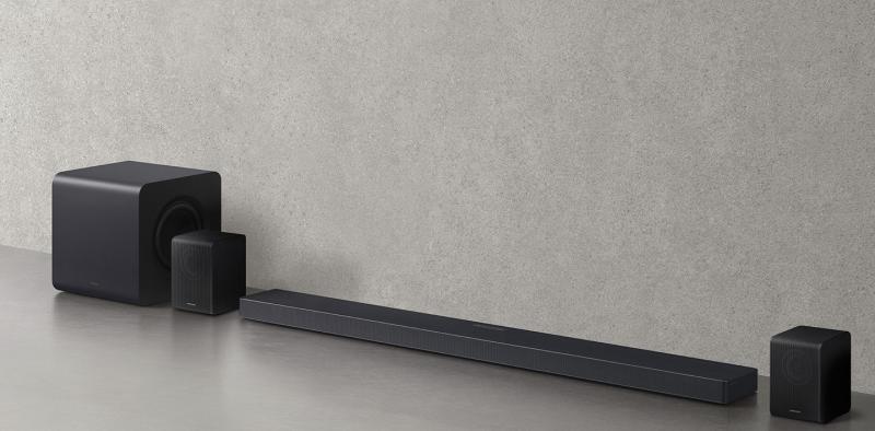 The speakers are designed to function as both front- and up-firing channels, automatically adjusting their output direction based on the soundbar's placement.