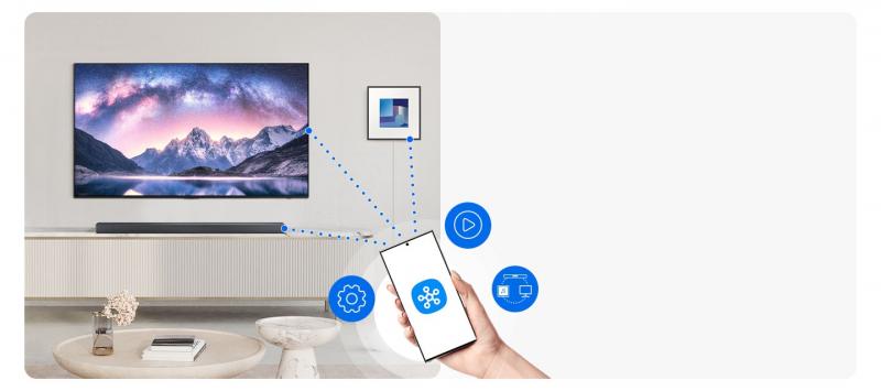 Easily control your soundbar with the SmartThings app. Connect it to your mobile device via Wi-Fi to adjust sound settings, enable group play or access voice assistant and music streaming features.