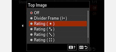 Multiple media playback lets you seamlessly display all images on two memory cards by selecting all slots as the display target during playback. Group display of images such as those shot continuously or with interval shooting is also supported. And if set in advance, a rating can automatically be applied to the first image in continuous burst or Pre-Capture groups, or a divider image inserted before the first image in groups, enabling quick scrolling through and location of groups using the custom dial during playback.
