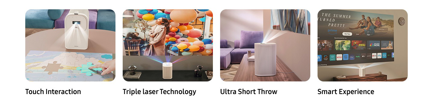 * This service only works when the TV and mobile device are turned on. ** Requires SmartThings app download and installation. *** Apple's AirPlay 3 feature supports simple screen sharing only, without touch functionality. **** Touch Interaction functionality may vary depending on how the projector is set up and the condition of the surface being projected on. *****Image simulated.