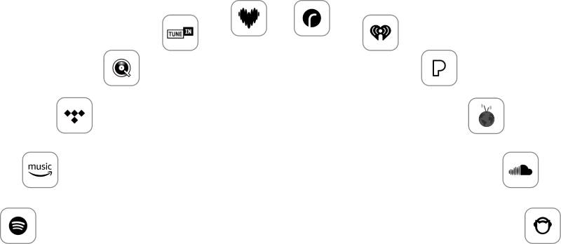 Spotify, Amazon Music, TIDAL, Qobuz, Deezer, Pandora, iHeartRadio, TuneIn, SoundCloud, and more.