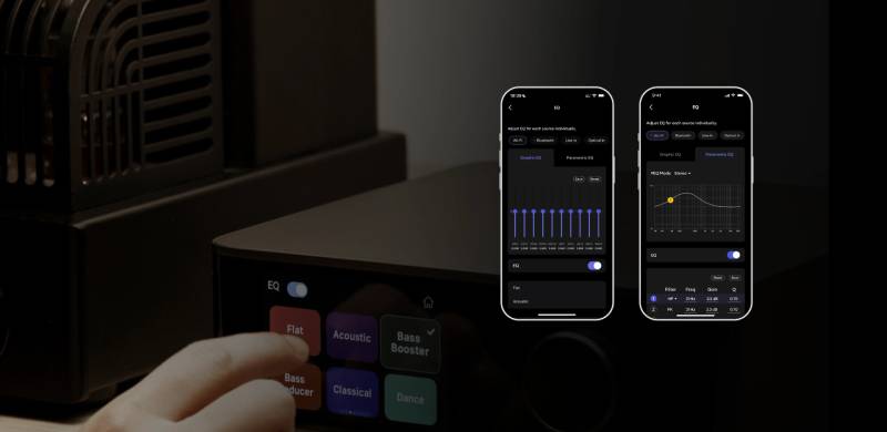 ▪ 24 Preset EQ Profiles ▪ 10-Band Graphic & Parametric EQ ▪ Built-in Room Correction with mic-guided acoustic tuning |