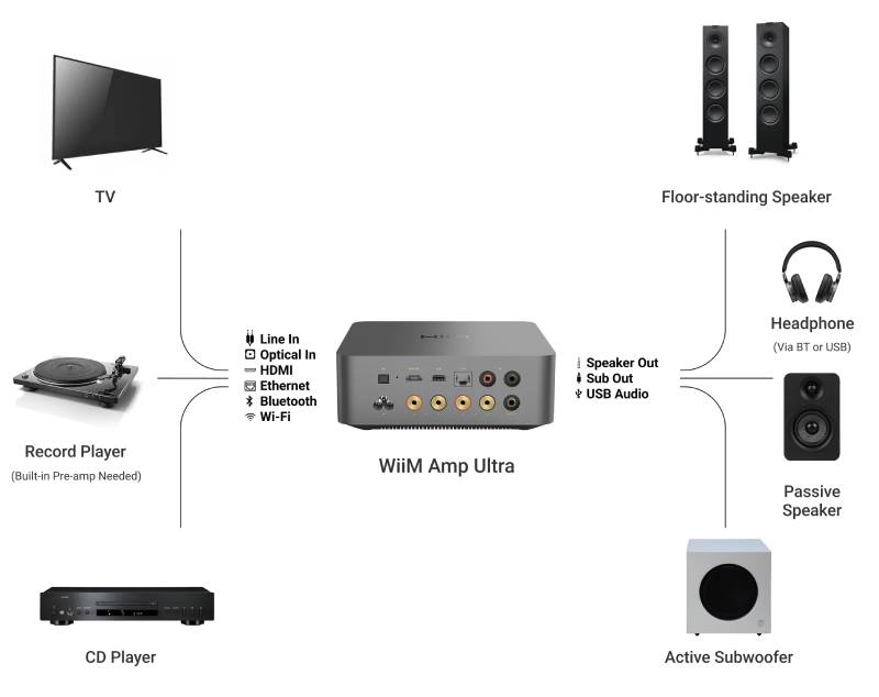 Easily integrate turntables, TVs, CD players, or stream to any WiiM or Bluetooth-enabled device.