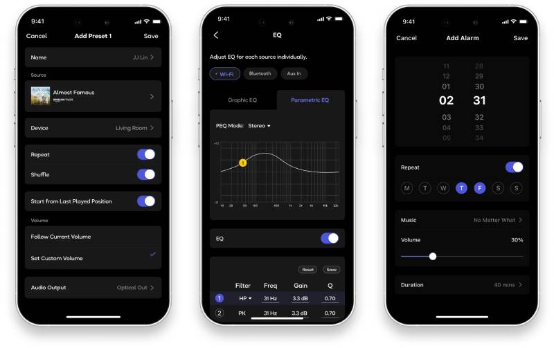 Instantly launch your favorite playlists, radio, or inputs with personalized settings for volume, EQ, shuffle/repeat, and play duration—right from the touchscreen, app, or WiiM Remote.