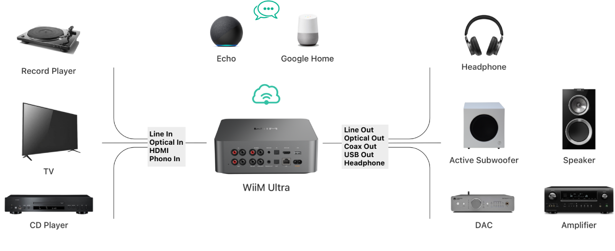 Effortlessly create a unified sound system across your home using the WiiM Ultra with existing Amazon Echo, Google Home, and WiiM devices. Easily manage music streaming throughout your space with the intuitive WiiM Home App—control volume, synchronize speakers, save your favorite tunes, set alarms, and customize settings, all from one central hub.