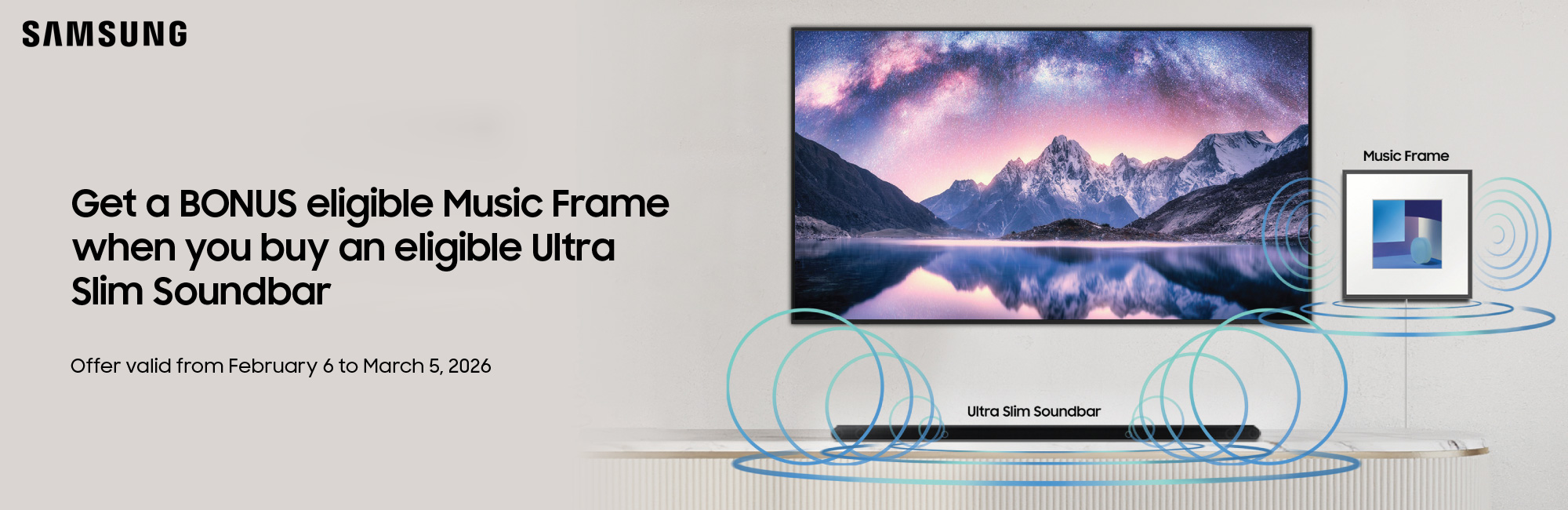 Get a Bonus eligible Music Frame when you buy an eligible Ultra Slim SoundbarOffer Valid From Feb 6th to Mar 5th, 2026
