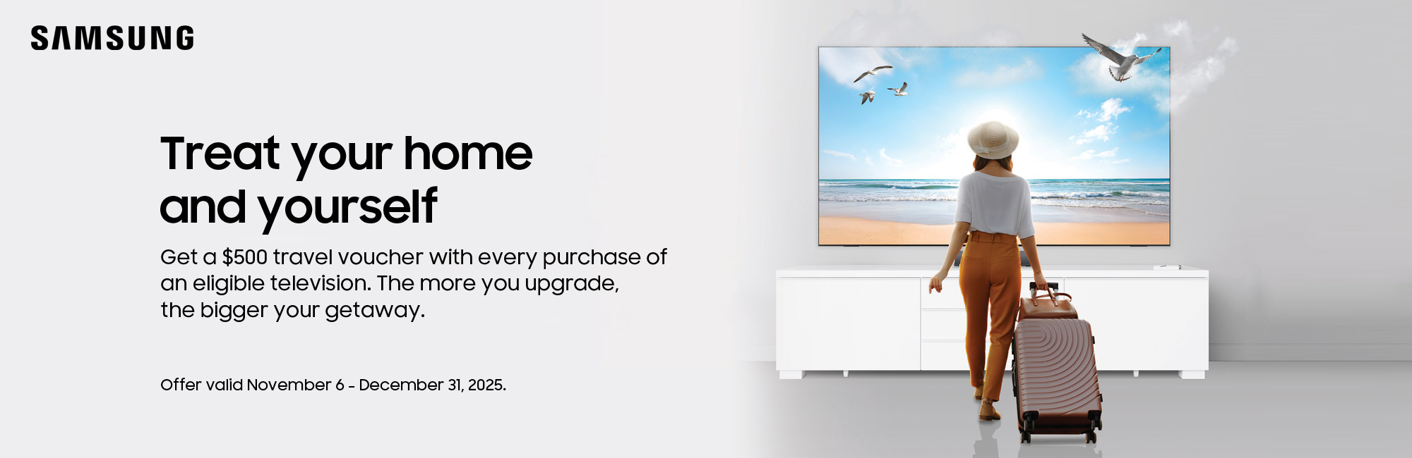 Get a $500 travel voucher with every purchase of an eligible television. The more you upgrade, the bigger your getaway.Offer Valid From Nov 6th - Dec 31st, 2025